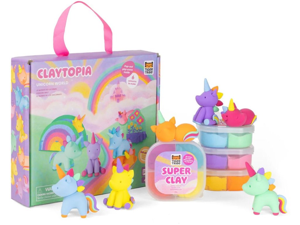 Tiger Tribe Claytopia – Unicorn World je kreativní sada, která dětem umožní popustit uzdu fantazii a vytvořit si vlastní kouzelný svět jednorožců. Pomocí barevné modelíny a tematických doplňků mohou děti modelovat jednorožce, dekorace i celé pohádkové prostředí.