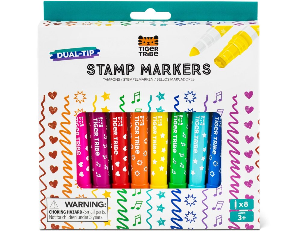 Multifunkční fixy a razítka 2 v 1 Tiger Tribe Dual-Tip Stamp Markers jsou kreativní výtvarná pomůcka, která spojuje kreslení a razítkování v jednom. Díky oboustrannému provedení mohou děti na jedné straně kreslit barevným fixem a na druhé straně vytvářet obrázky pomocí veselých razítek.